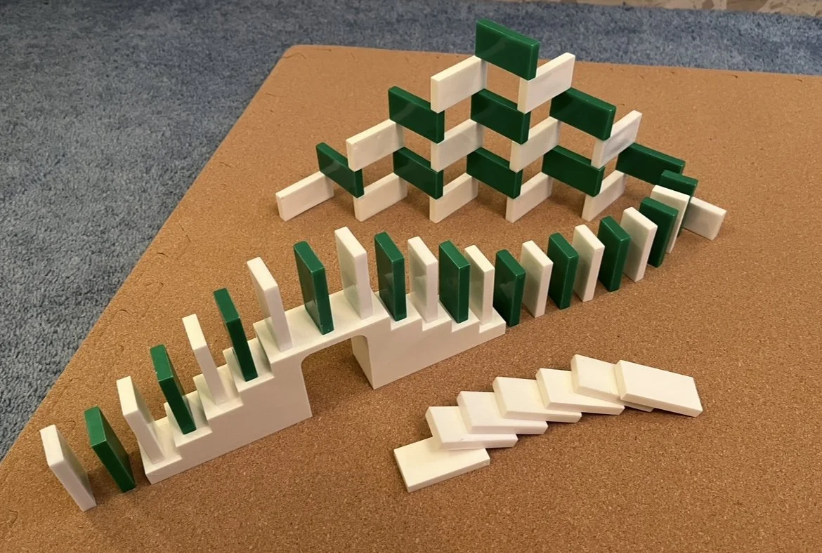 Topple Academy Domino Starter Kits are available in-person at all workshops we host and also at our pop-up stalls at markets and fayres. The starter kit consists of 50 dominoes in at least two colours, a 3D Printed domino bridge and a step-by-step domino building guide. These are priced at £20.